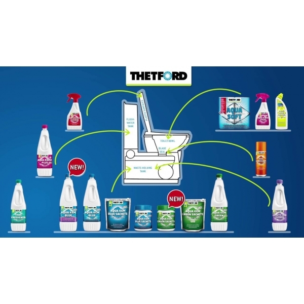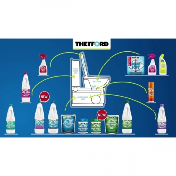 Výkonný, koncentrovaný, periodický čistič na výkaly a nádrže na šedou vodu. Pro dlouhou, čistou a čerstvou životnost obou nádrží. Pro čištění nádrže na šedou vodu doporučujeme používat společně s čističem Thetford Grey Water Fresh.