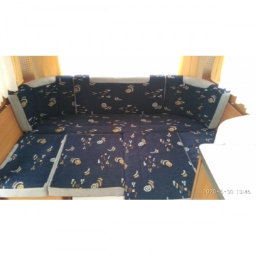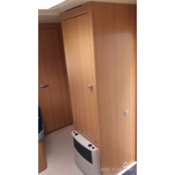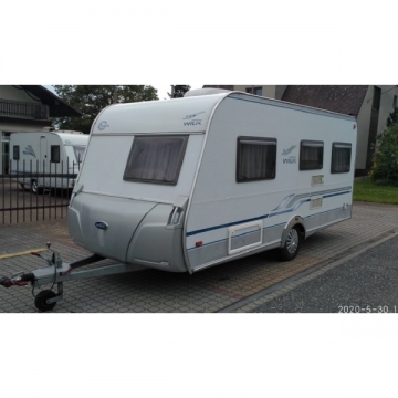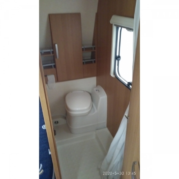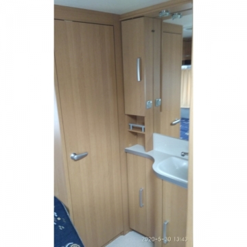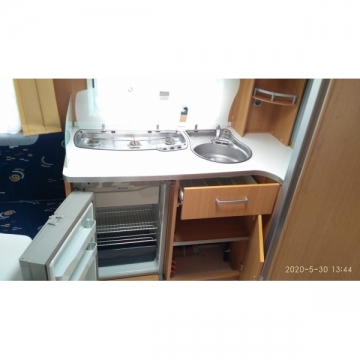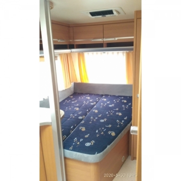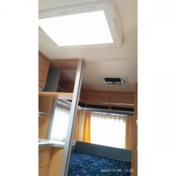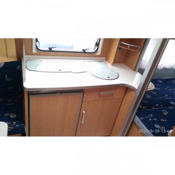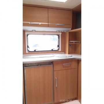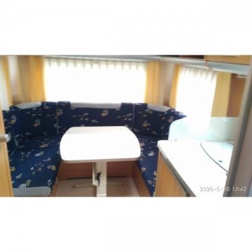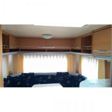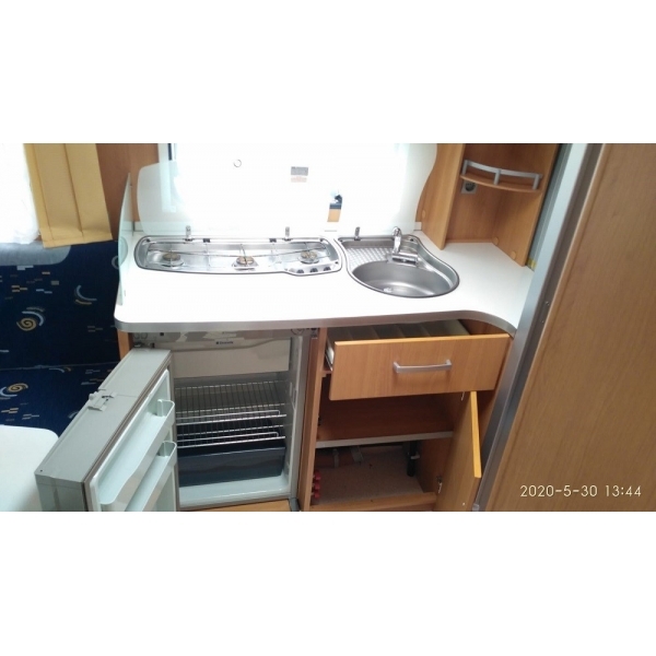 Velké sezení L i rozložitelné na spaní 160x220cm, velká kuchyň - s dřezem a 3 plotýnkovým vařičem, vysoká lednice s mrazákem, ložnice uzavíratelná pevnými posuvnými dveřmi - velké letiště 150x200cm s novou matrací, držák TV, koupelna - s umyvadlem, maceračním WC a samostatnou sprchou odvětrávanou střešním oknem s ventilátorem, elektrický boiler Truma 10 l na teplou vodu, nadrž na vodu plnitelnou z venku, topení Truma – plynové + elektrické s dvojitým rozfukem tepla po celém karavanu ( provětrávané i mrtvé prostory např. skříní, nočních stolků apod.), originál koberce na míru, všechna okna otevírací s moskytiérou a nočním zatemněním, mnoho úložných prostor – pod letištěm, pod sezením, skřínky, skříň, velké šuplíky atd., potahy na sedačkách v barvě koberců.