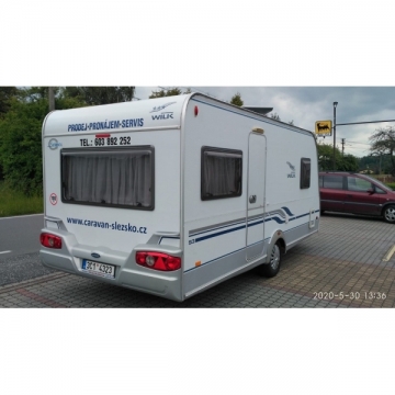 Dvounápravový podvozek AL-KO s ALU koly, nájezdová brzda se stabilizačním přípojným kloubem AL-KO a elektronickým stabilizačním systémem ATC, carbonový kryt oje, 4x stabilizační nožičky, ztmavená okna – přívěs se nepřehřívá, klimatizace Dometic, výsuvný stožár pro anténu na TV, nová kompletní stanová předsíň s konstrukcí, plastová podlážka do předstanu, přední kufr s prostorem pro 2 plynové 10kg lahve, rezervní kolo, připojovací kabel 230V atd., ze spodu caravanu vnější přívod pro tlakovou vodu.